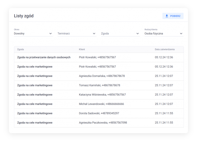 W aplikacji możesz zobaczyć dane klientów umieszczone w formularzu rezerwacji, a także sprawdzić wszystkie wyrażone zgody wraz z dokładną datą i godziną. W razie potrzeby listę zgód pobierzesz w formacie XLS. Wyszukiwanie informacji w zakładce Dokumenty ułatwią filtry (okres, terminarz, zgoda, rodzaj klienta). Oprócz standardowych zgód RODO i marketingowych możesz dodawać zgody o dowolnej treści, odpowiednie dla typu działalności, którą prowadzisz.