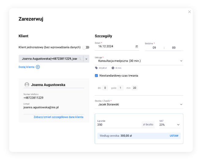 Wykonywana usługa zajmie więcej lub mniej czasu niż zwykle? A może wyjątkowo chcesz zaoferować klientowi niższą cenę lub ją podnieść? Nic prostszego, dla każdej rezerwacji możesz podać własną cenę i czas trwania usługi.