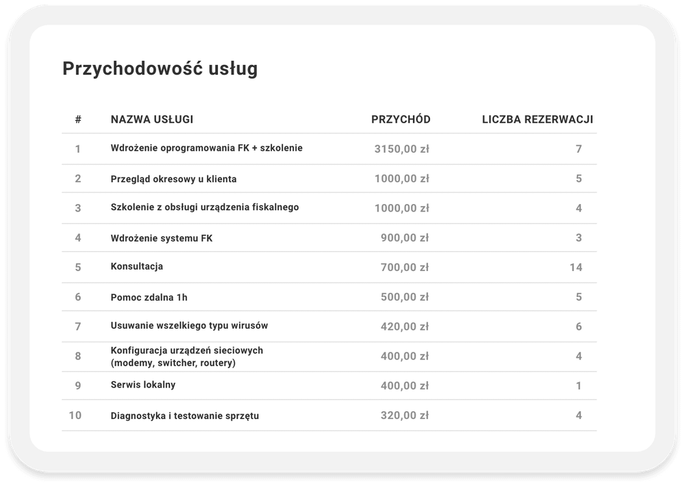 Bądź na bieżąco z najważniejszymi informacjami. Jednym kliknięciem wywołaj raporty o przychodowości i popularności usług oraz najważniejsze dane o klientach. Twórz cenniki i grafiki pracy.