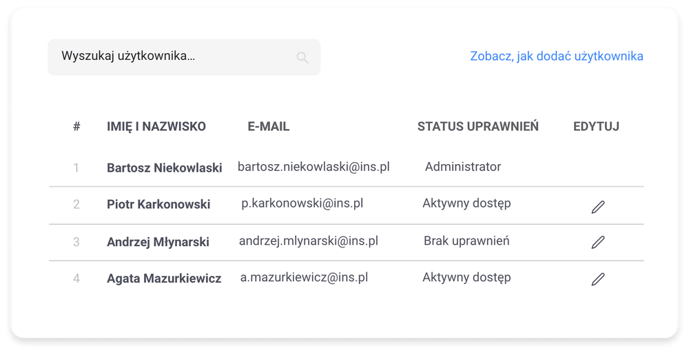 Jeśli aplikacji zarezerwuj.pl będzie używać więcej niż jedna osoba, to każdej z nich możesz przyznać szczegółowe indywidualne uprawnienia dostępu do danych, terminarzy i modułów systemu. Możesz też nadać kolejnemu użytkownikowi uprawnienia administratora.