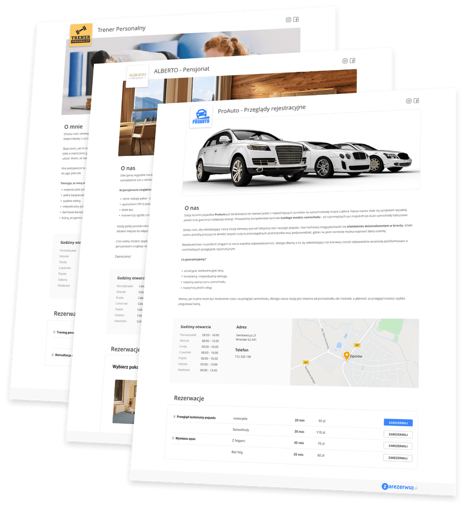 Dzięki stronie wizytówkowej klienci łatwiej znajdą Twoją firmę i będą mogli od razu dokonać rezerwacji. Stwórz serwis samodzielnie korzystając z wygodnego szablonu, w którym łatwo dodasz grafiki, niezbędne informacje i formularz rezerwacji. Strony wizytówkowe dostępne są dla posiadaczy 12-miesięcznego abonamentu.